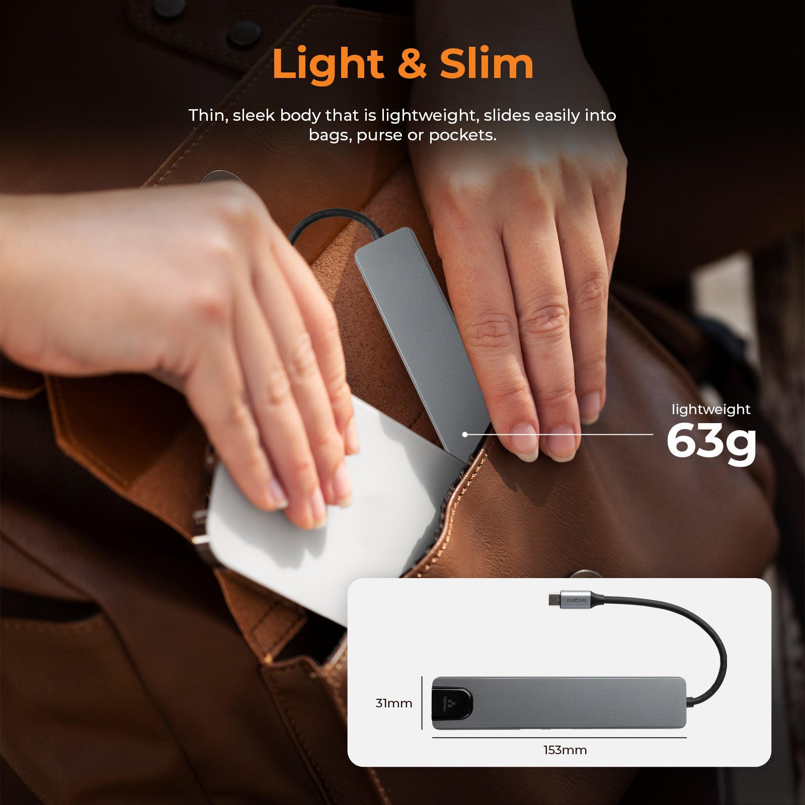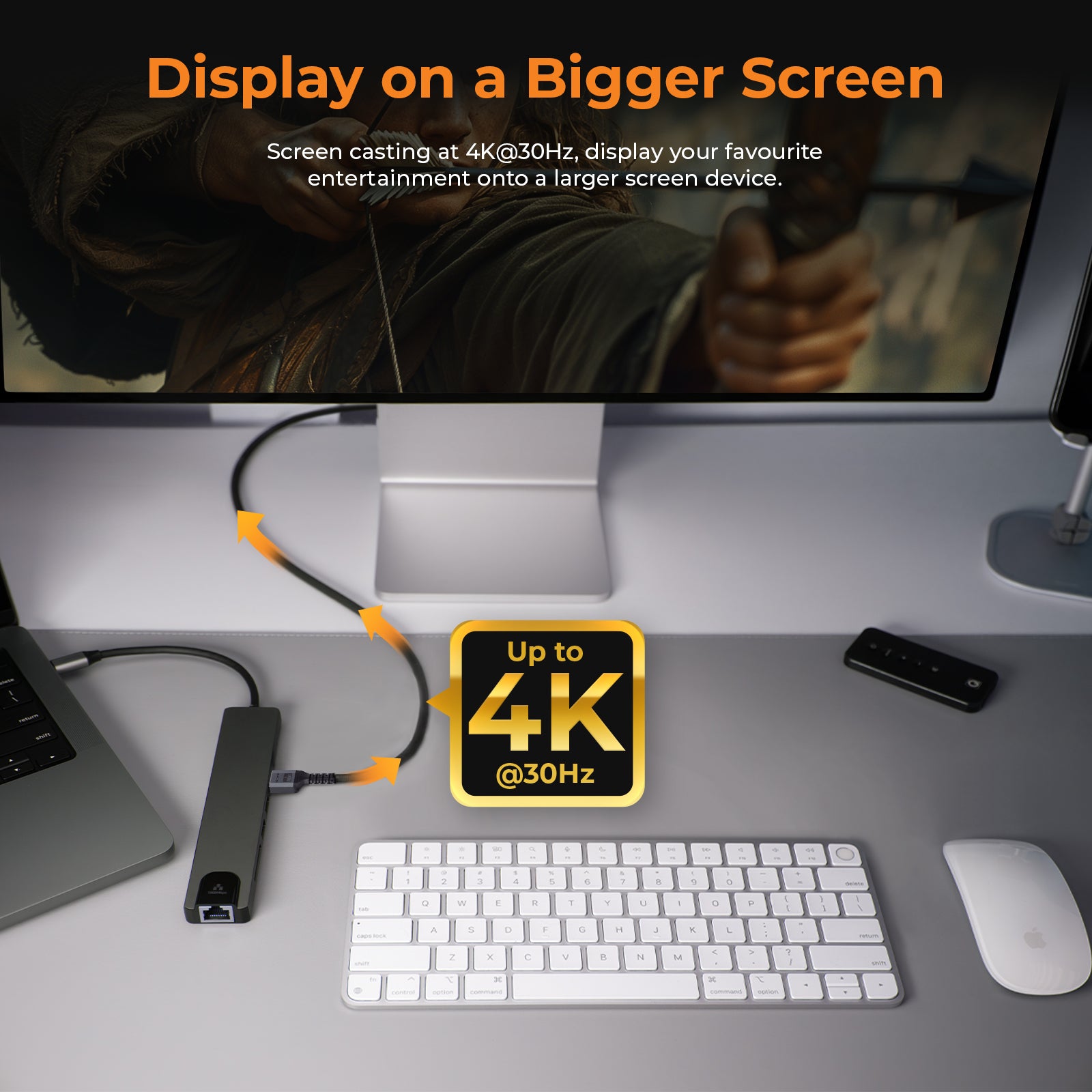 Expand your single USB-C port into 4K@60Hz HDMI Port, SD/TF Card Reader, 100W PD charging, RJ45 Ethernet and 2 USB-A + 1 USB-C 3.0 ports for data transfer.