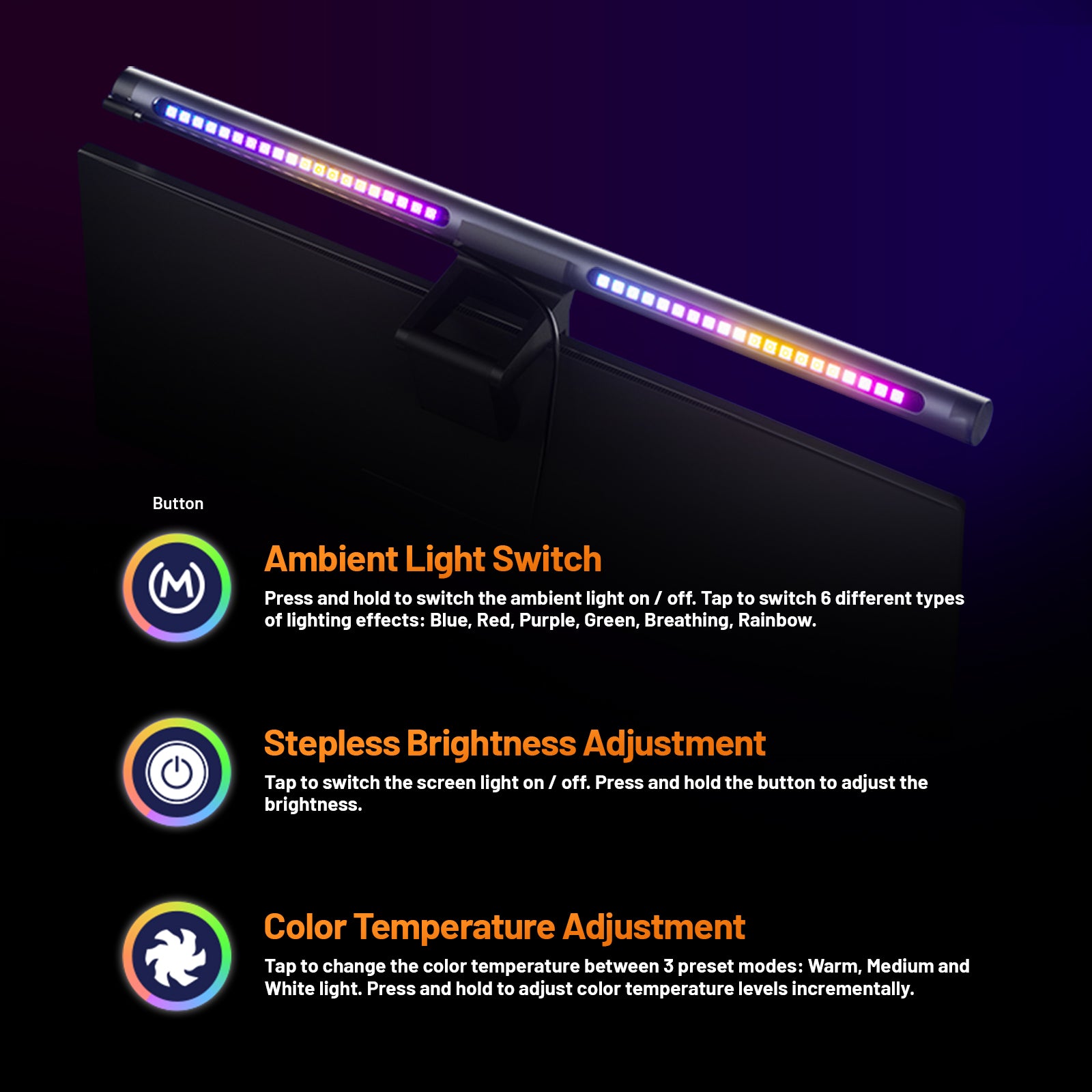 Monitor light bar with built-in RGB backlight for greater ambience and immersion. Comes with 16 million RGB colors and stepless touch adjustment for brightness, ambient light and color temperature.