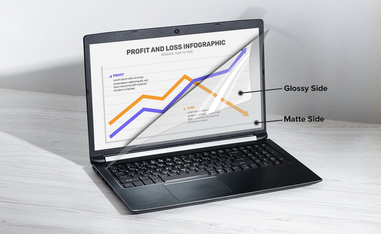 Reversible 2-in-1 blue light filter. Choose between a glossy side and glare-reducing matte.