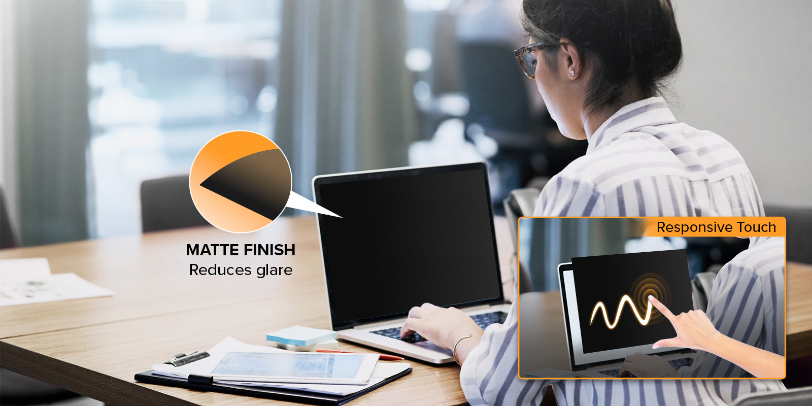 Matte anti-glare finish delivers a comfortable, glare-free view while keeping touch control highly responsive.