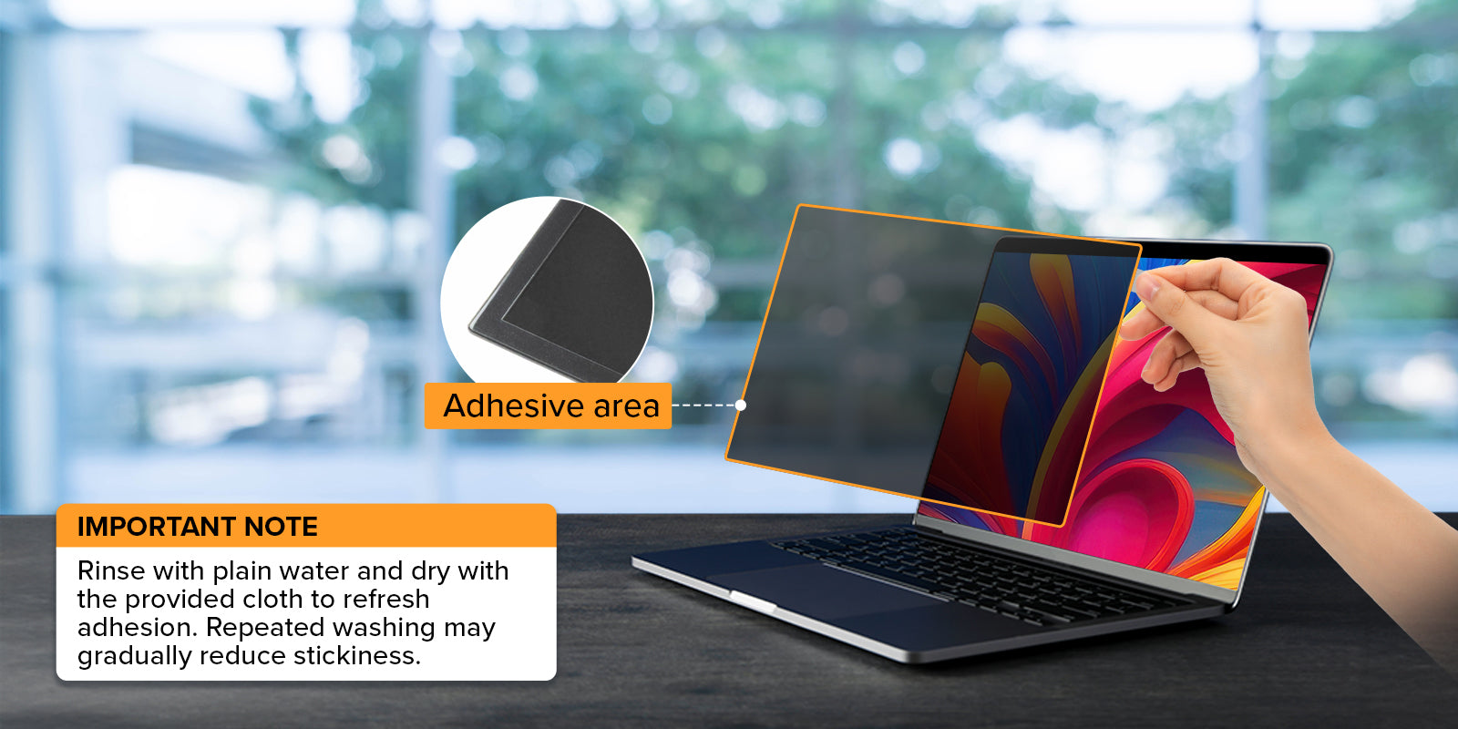Adhesive runs along the border of the privacy filter for a seamless fit, and can be removed or reapplied with ease.