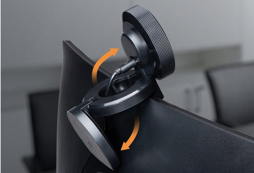 Flexible mounting clip attaches securely to laptops or desktop monitors.